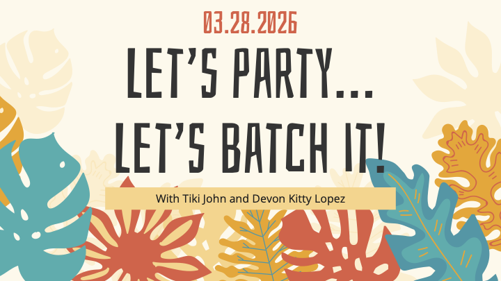 Batch It! Saturday, March 28, 2026 3:00 PM 4:00 PM Google Calendar ICS Tiki John Atkins and Devon “Kitty” Lopez explain the benefits and pitfalls of pre-batching cocktails for parties and events. Held at Tiki-A-Go-Go in Orlando Florida. View fullsize Click here to view their presentation.